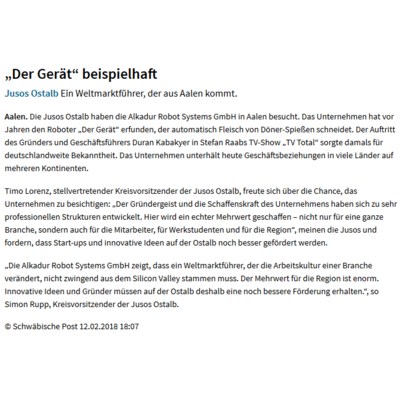 Unser Vorsitzender Simon Rupp und unser stellv. Kreisvorsitzender Timo Lorenz in der Schwäbischen Post über unseren Besuch bei der Alkadur Robot Systems GmbH - DerGerät.